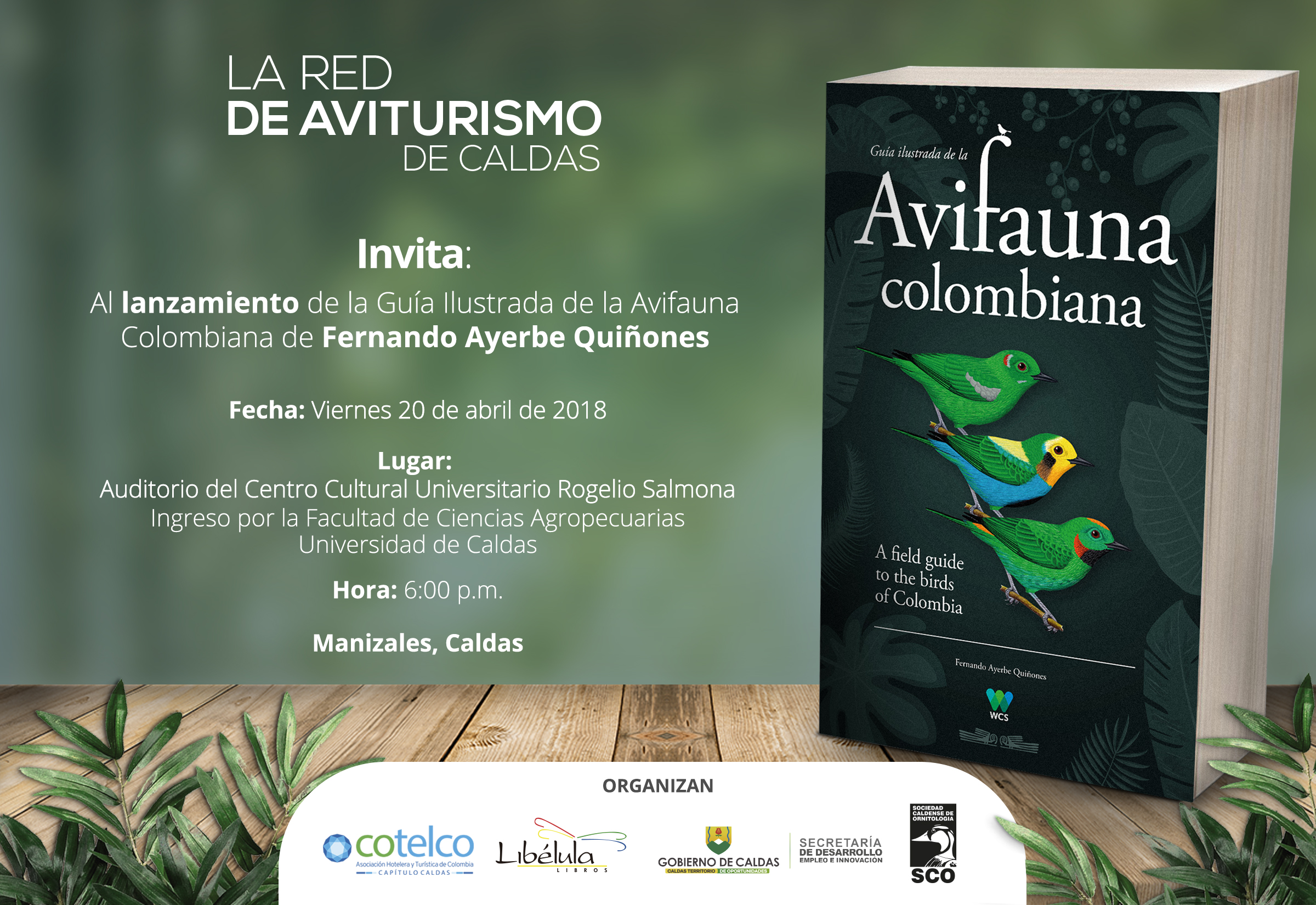 En el auditorio Centro Cultural “Rogelio Salmona” de la Universidad de Caldas de Manizales tiene lugar este viernes 20 de abril a las 6 pm. el lanzamiento de la Guía Ilustrada de la Avifauna Colombiana, autoría de Fernando Ayerbe Quiñones.